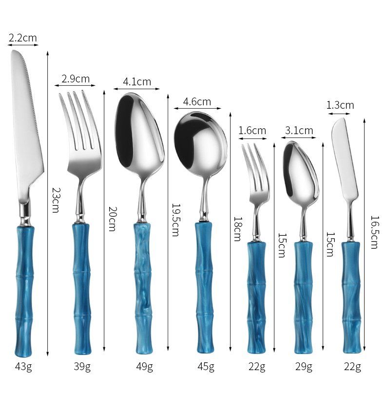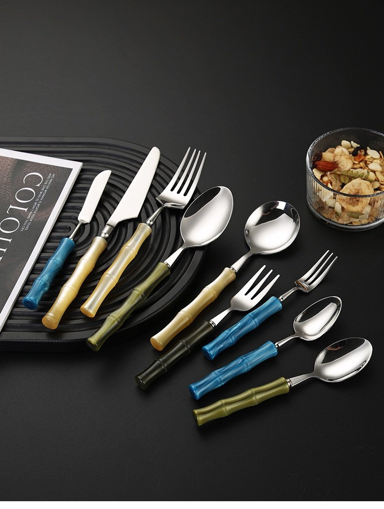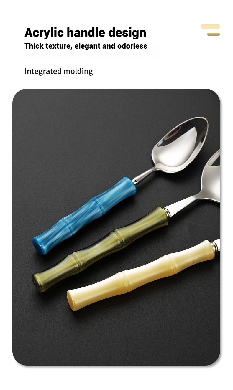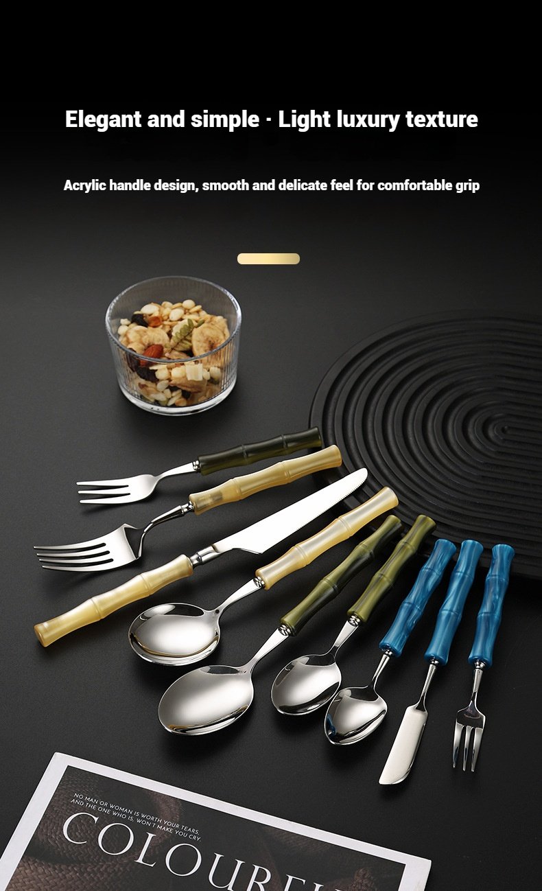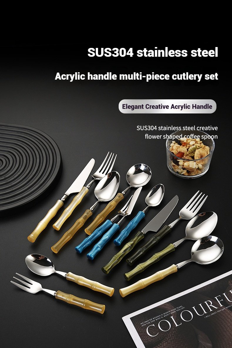 SLCJ-0003 304 stainless steel creative Western dining set with anti-slip acrylic handles. There are 7 different styles of knives, spoons and forks, and 3 colors are available for selection
