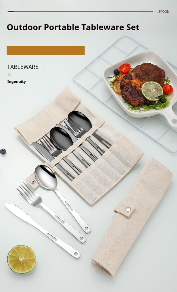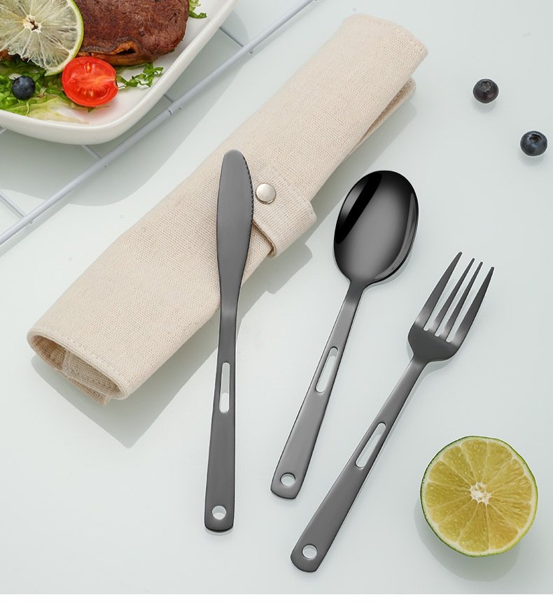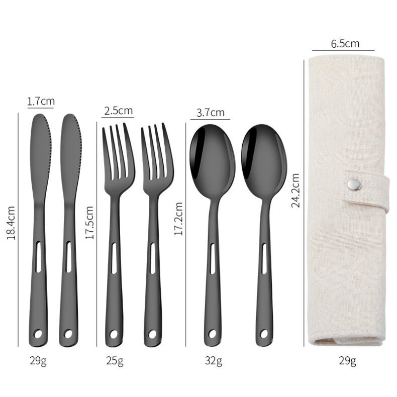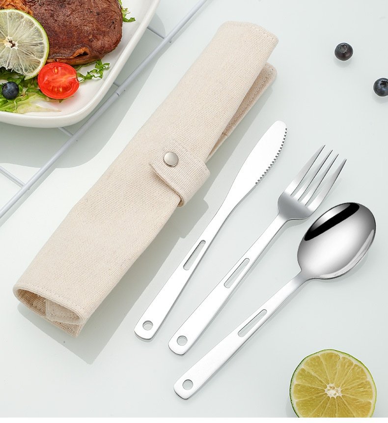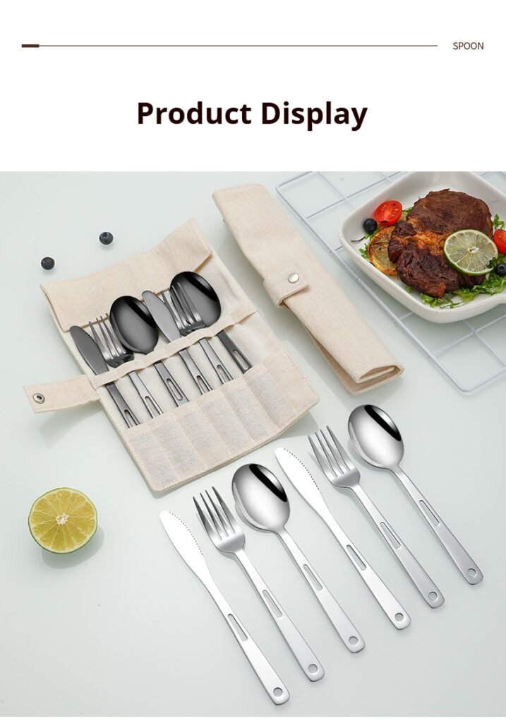 CJ-0009 Stainless steel outdoor knife, fork and spoon set of 7 pieces. Roll-up storage bag. Lightweight hollow design makes it more portable. Easy to carry. Portable tableware for camping and outdoor activities.