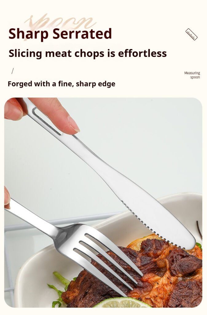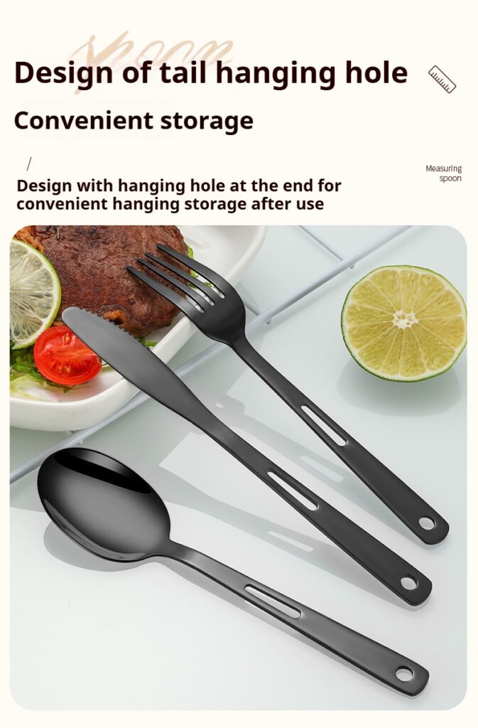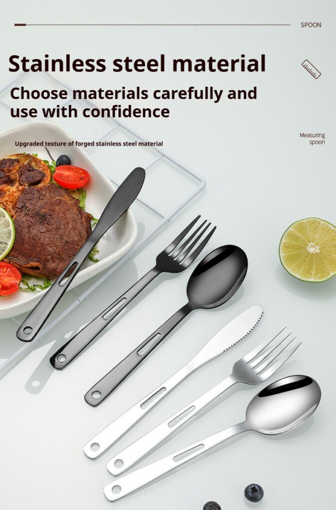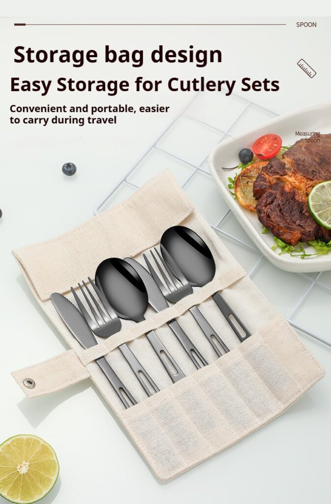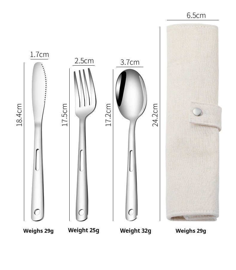 CJ-0009 Stainless steel outdoor knife, fork and spoon set of 7 pieces. Roll-up storage bag. Lightweight hollow design makes it more portable. Easy to carry. Portable tableware for camping and outdoor activities.